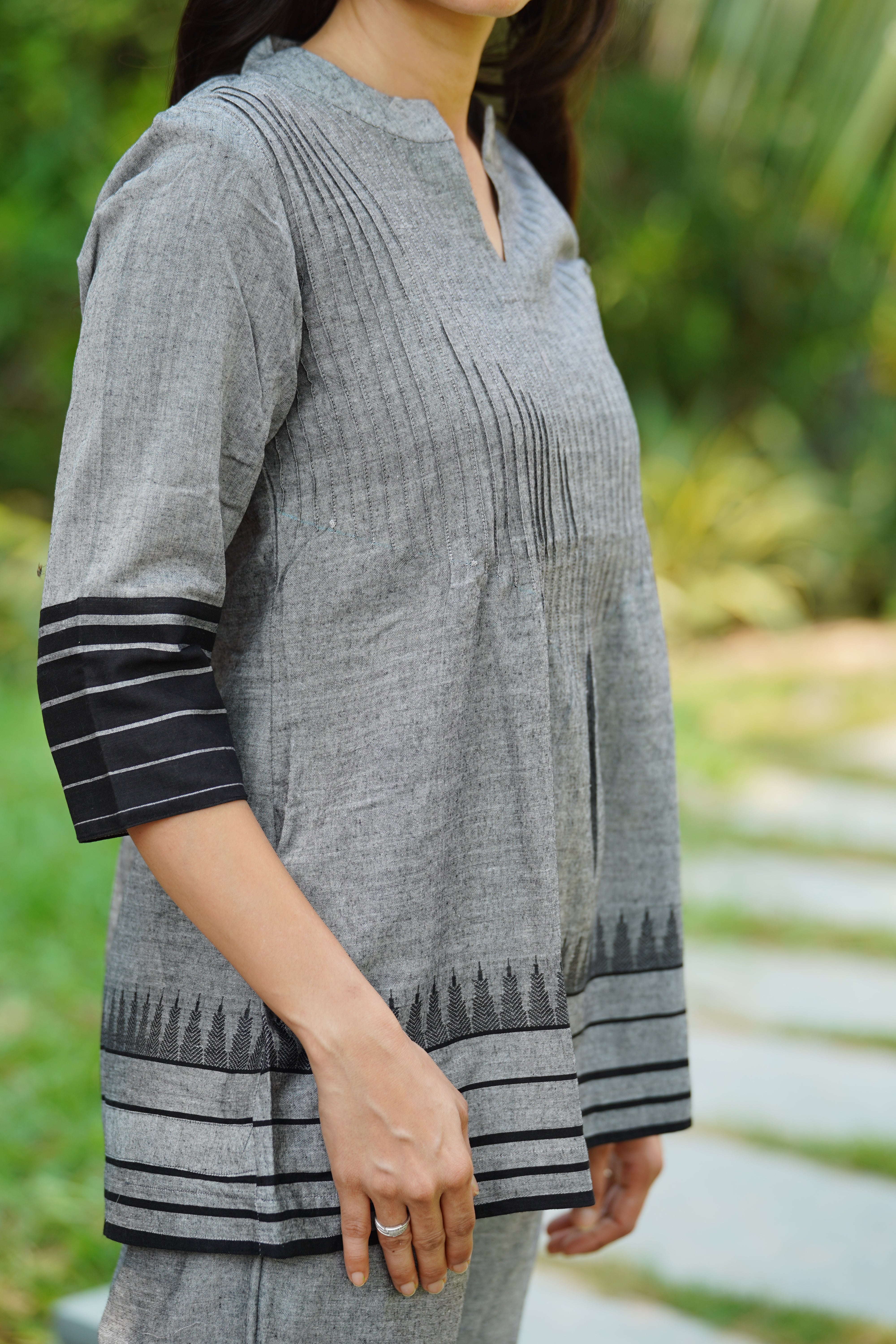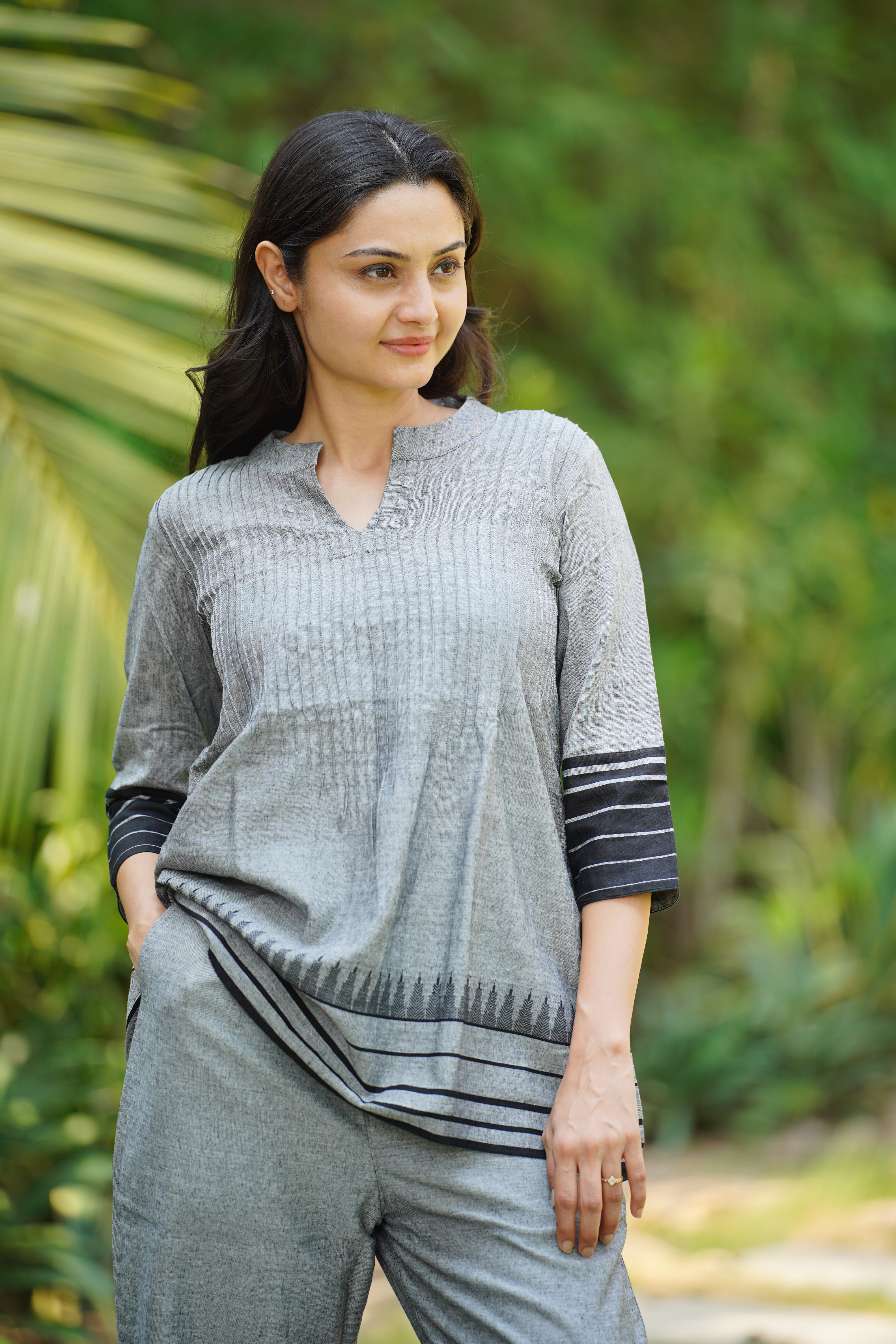 Vibrant Hues: From the vibrant saffron of the Saffron Co-ord Set to the bold checks in yellow, white, and grey, and the grey elegance of the Chic Pintucks Set, revel in a palette that stands out.