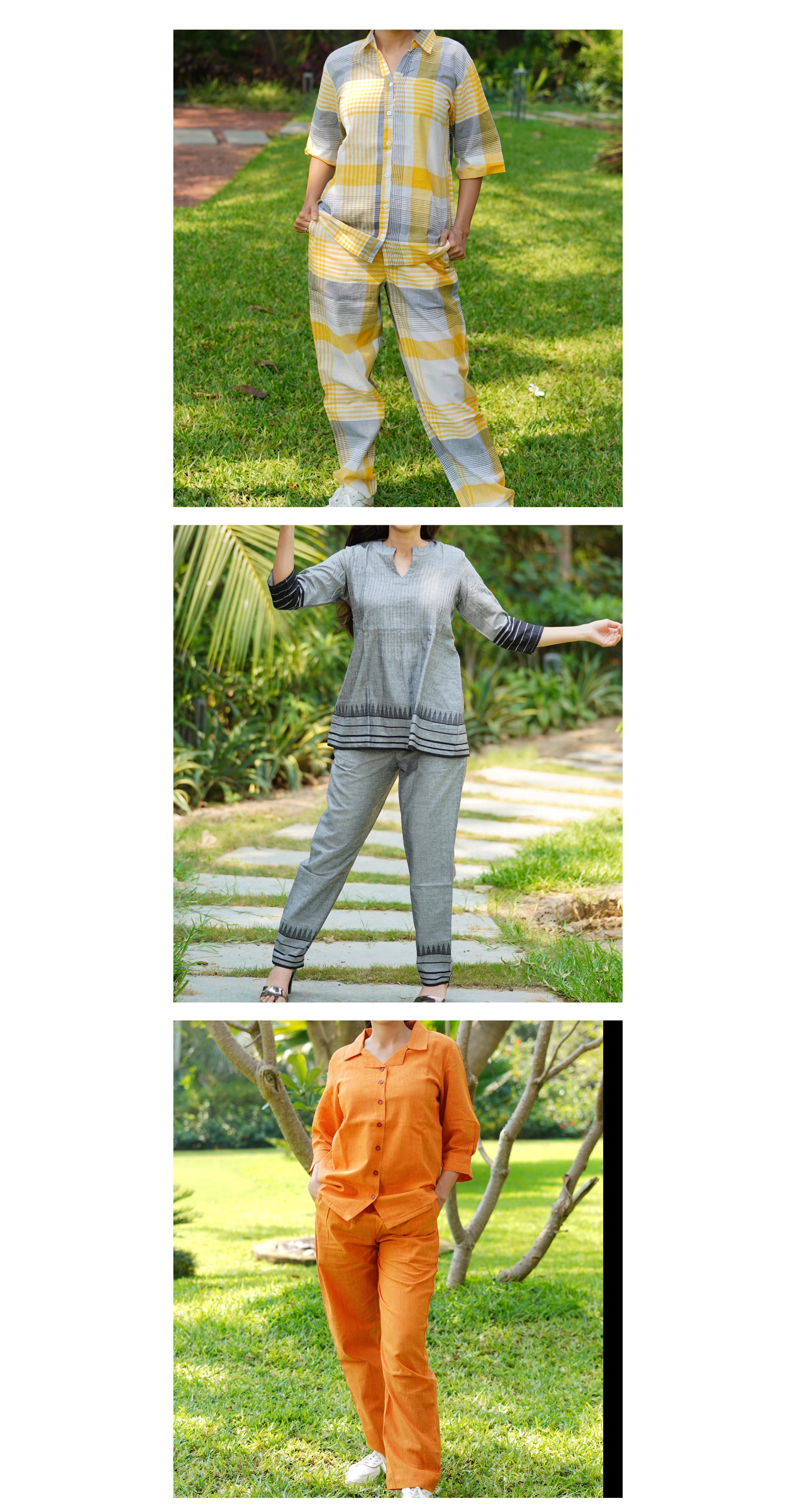 Diverse Silhouettes: Each set presents a distinct silhouette—straight cuts in the Bold Checks, flared elegance in the Chic Pintucks, and a straight silhouette in the Saffron Co-ord Set—ensuring diversity in your wardrobe.