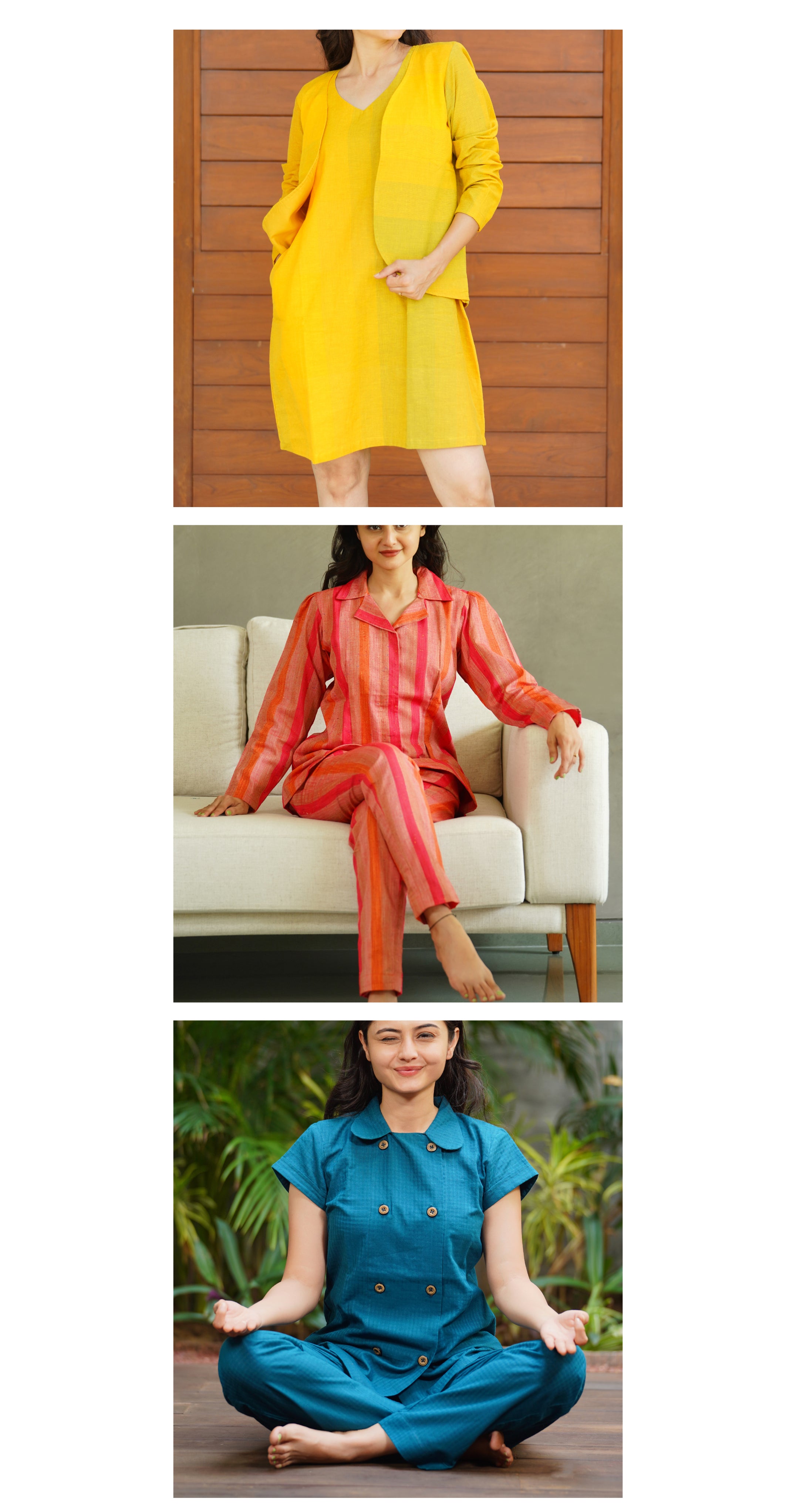 Day-to-Night Glamour: From the Dawn to Dusk Coat Set in Yellow to the Poise Blazer Co-ord Set in Pink and Azure Checks Co-ord Set, experience a seamless transition from day to night with glamorous ensembles.