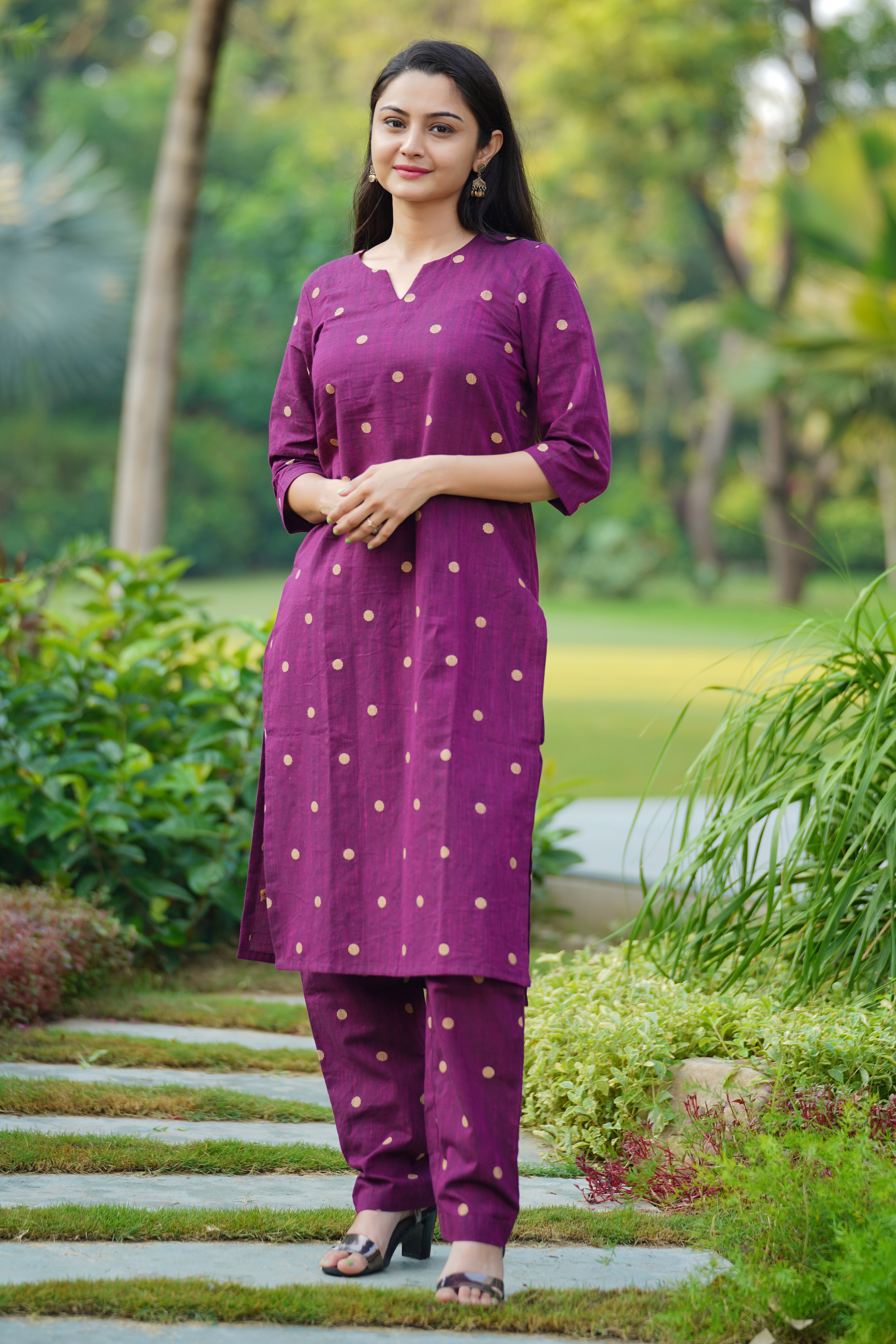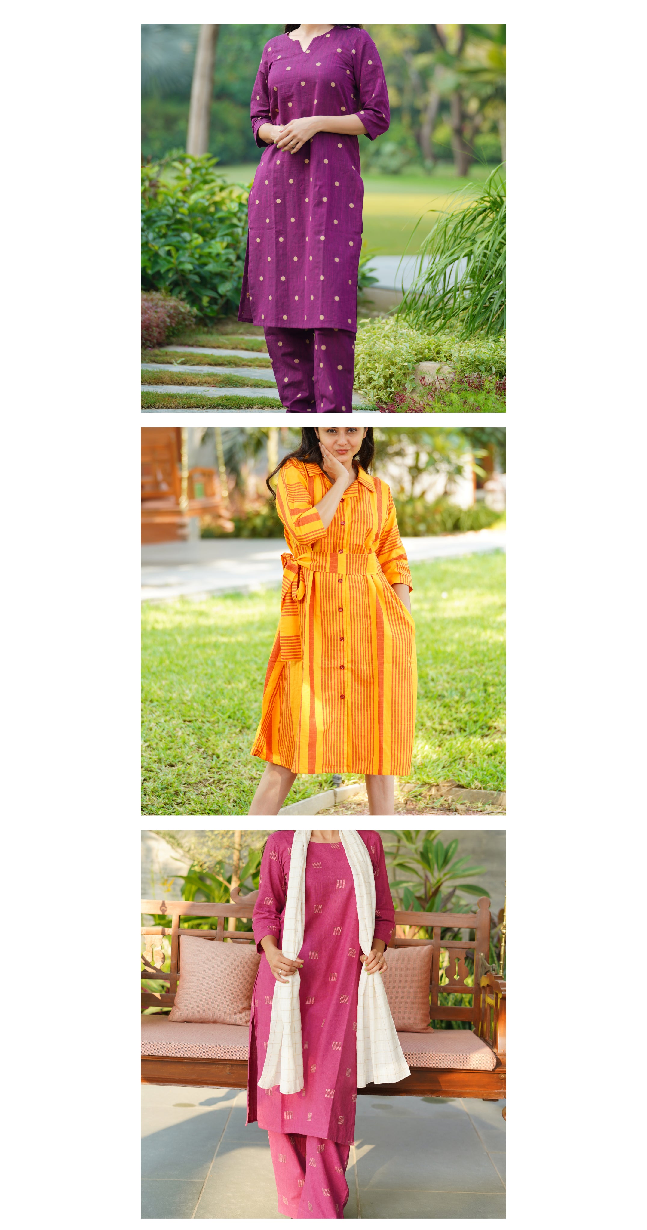 Meticulously crafted, each piece in this combo is a testament to skilled artistry, making you stand out with unique designs and attention-grabbing details.Royal Elegance: Immerse yourself in royal elegance with the Elegant Curve Kurta in Purple, Marigold Shirt Dress, and Magenta Rose Katha Kurta Set combo.
