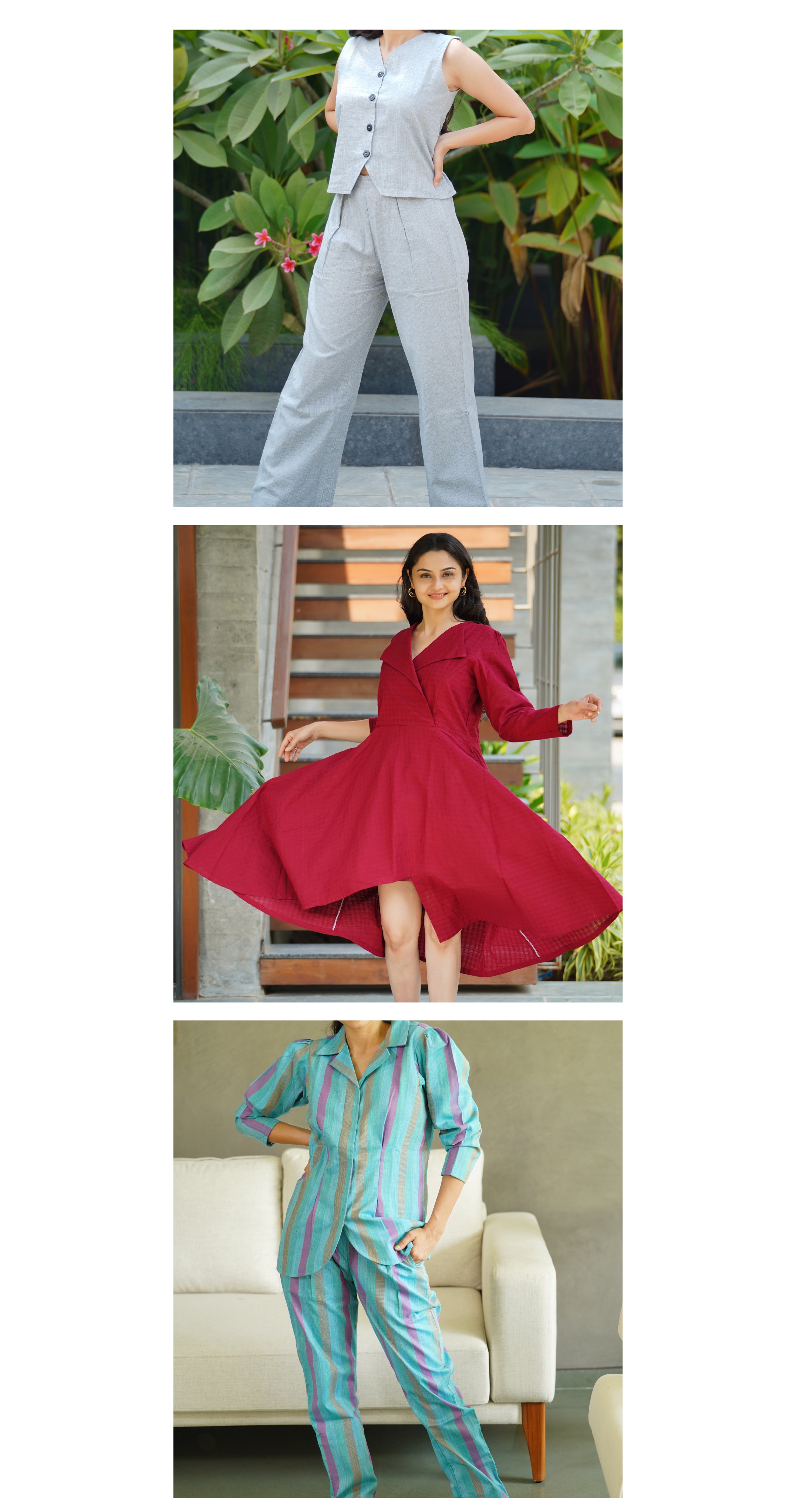 Floral Grace: Grey Bloom Co-ord Set introduces floral grace, while Blush Flare Dress and Poise Blazer add unique touches, creating a curated collection for varied occasions.