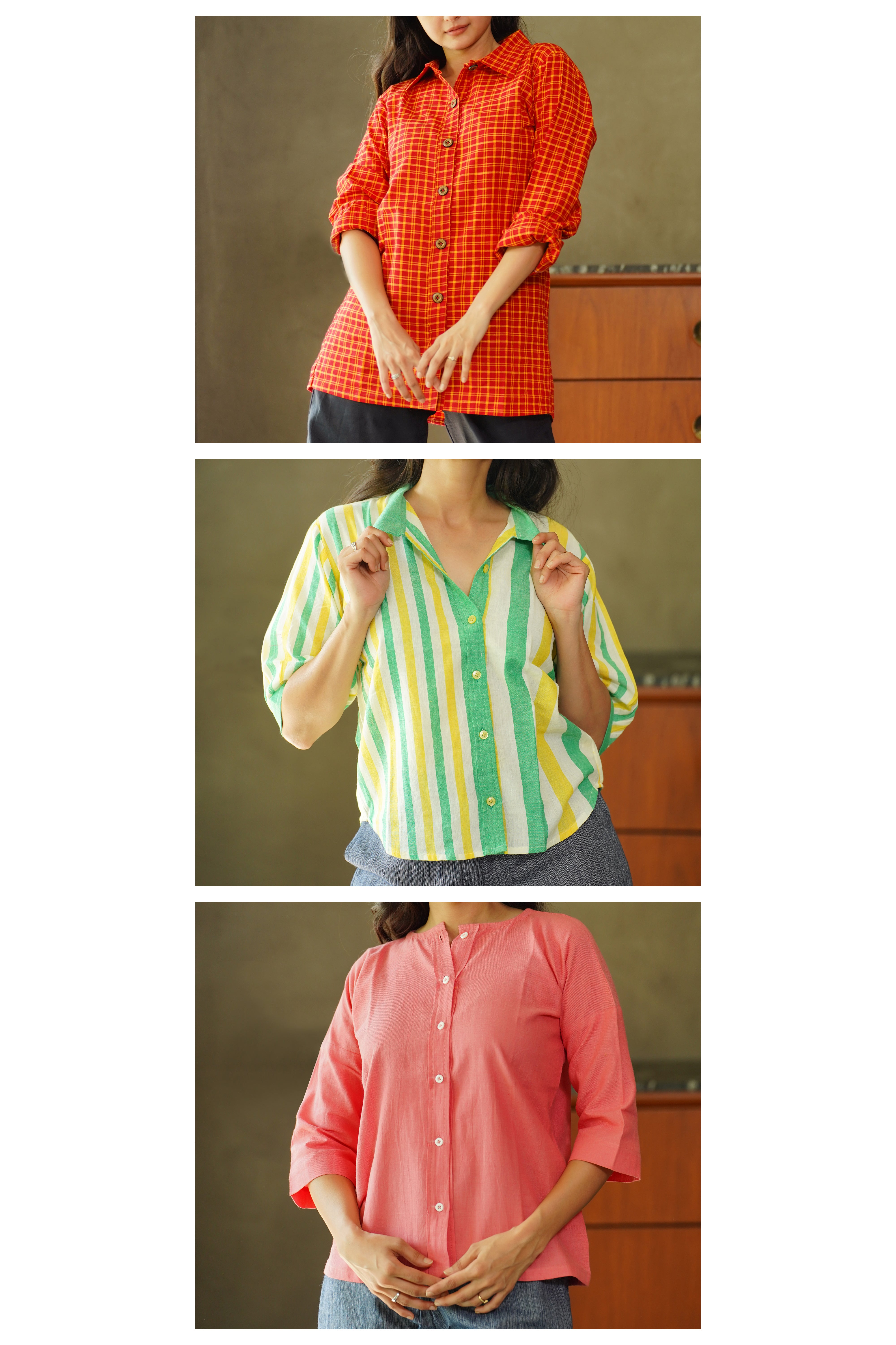 Versatile Style for Every Occasion: This combo brings together the Whiz Checks Shirt, the Cool Stripes Short Shirt in Green, and the Coral Blush Short Shirt. From formal gatherings to casual outings, these shirts cover all bases.